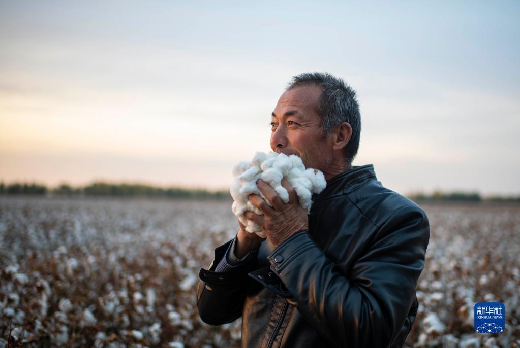 在一塊待采收的棉田,陸高林手捧棉花,貼面感受棉花的質(zhì)量(10月23日攝)。新華社記者 胡虎虎 攝