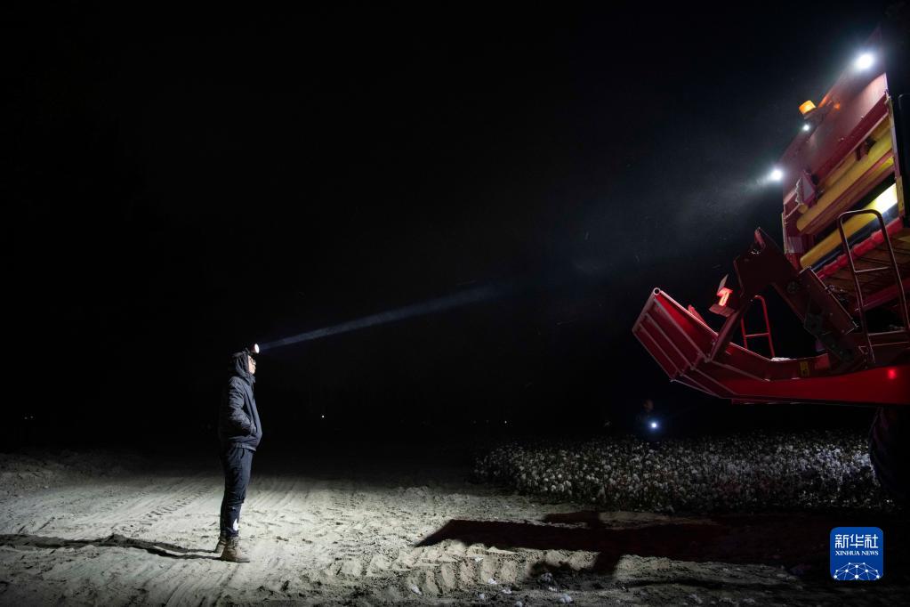 夜幕降臨,陸德文在棉田里守候采棉機(jī)轉(zhuǎn)場(10月22日攝)。新華社記者 胡虎虎 攝