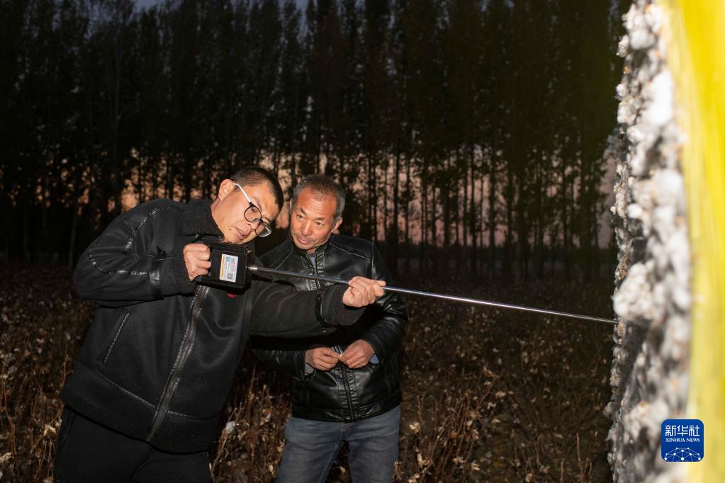 在新疆塔城地區(qū)沙灣市大泉鄉(xiāng)三道溝村,陸高林(右)和兒子陸德文使用儀器檢測已采收棉花的濕度(10月23日攝)。棉花售賣時(shí),軋花廠會對棉包進(jìn)行質(zhì)量抽測,濕度過高會影響價(jià)格。新華社記者 胡虎虎 攝
