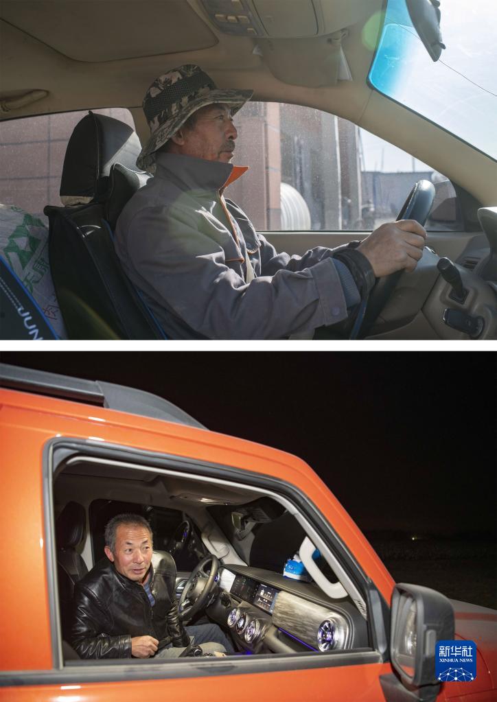 拼版照片:上圖為春播時(shí)節(jié),陸高林開車載著農(nóng)資去棉田干活(4月15日攝);下圖為秋收時(shí)節(jié),陸高林在新?lián)Q的越野車內(nèi)等候采棉機(jī)轉(zhuǎn)場(10月22日攝)。新華社記者 胡虎虎 攝