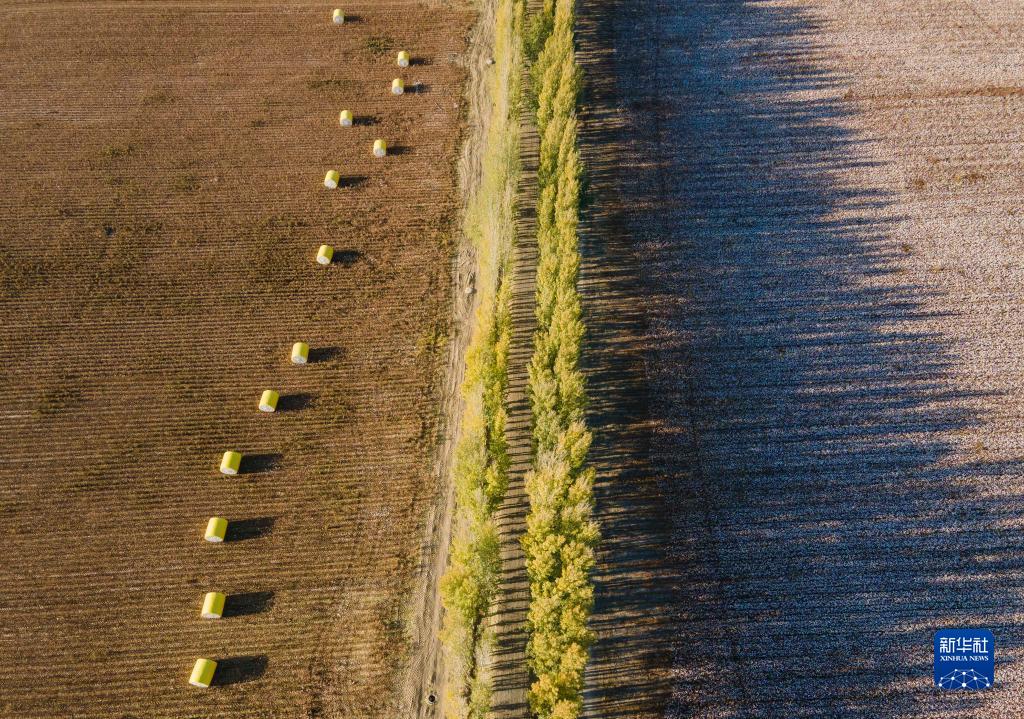 這是在新疆塔城地區(qū)沙灣市大泉鄉(xiāng)三道溝村拍攝的陸高林家的棉田(10月24日攝,無人機(jī)照片)。畫面左側(cè)為已采收的棉田,棉包擺放在地上,待價(jià)格合適時(shí),這些棉包將被運(yùn)往軋花廠售賣;右側(cè)為待采收的地塊。新華社記者 胡虎虎 攝