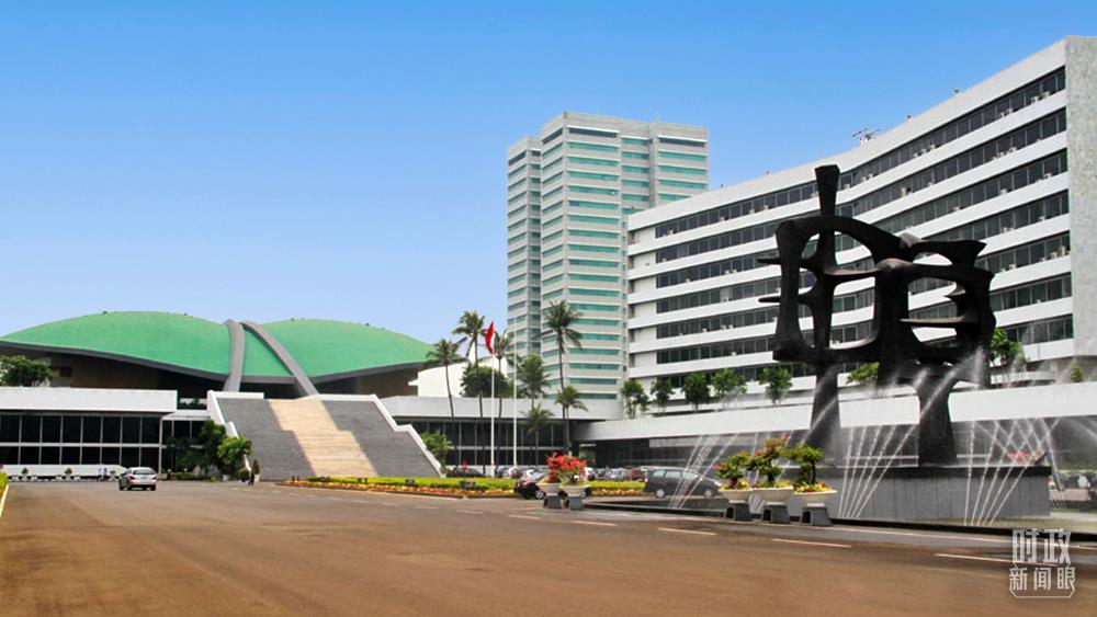 △印度尼西亞國會外景。2013年10月,習(xí)主席在這里發(fā)表演講首次提出建設(shè)21世紀“海上絲綢之路”。(總臺國廣記者蔡靖骉拍攝)
