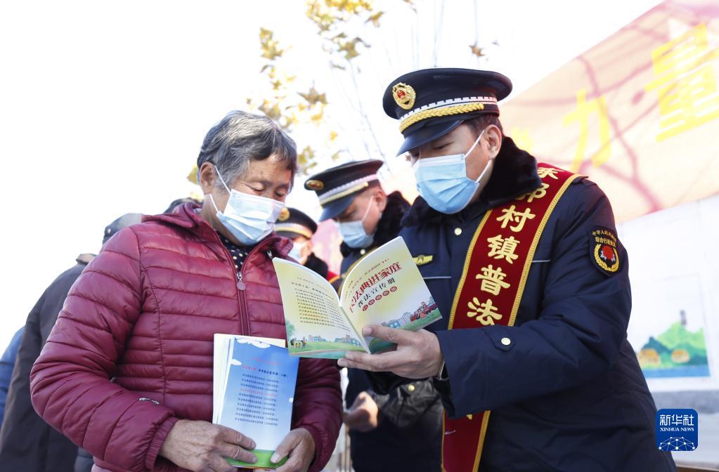 12月4日,在河北省邢臺市襄都區(qū)東郭村鎮(zhèn)南康莊村,普法志愿者在給村民進(jìn)行普法宣傳。新華社發(fā)(張馳 攝)