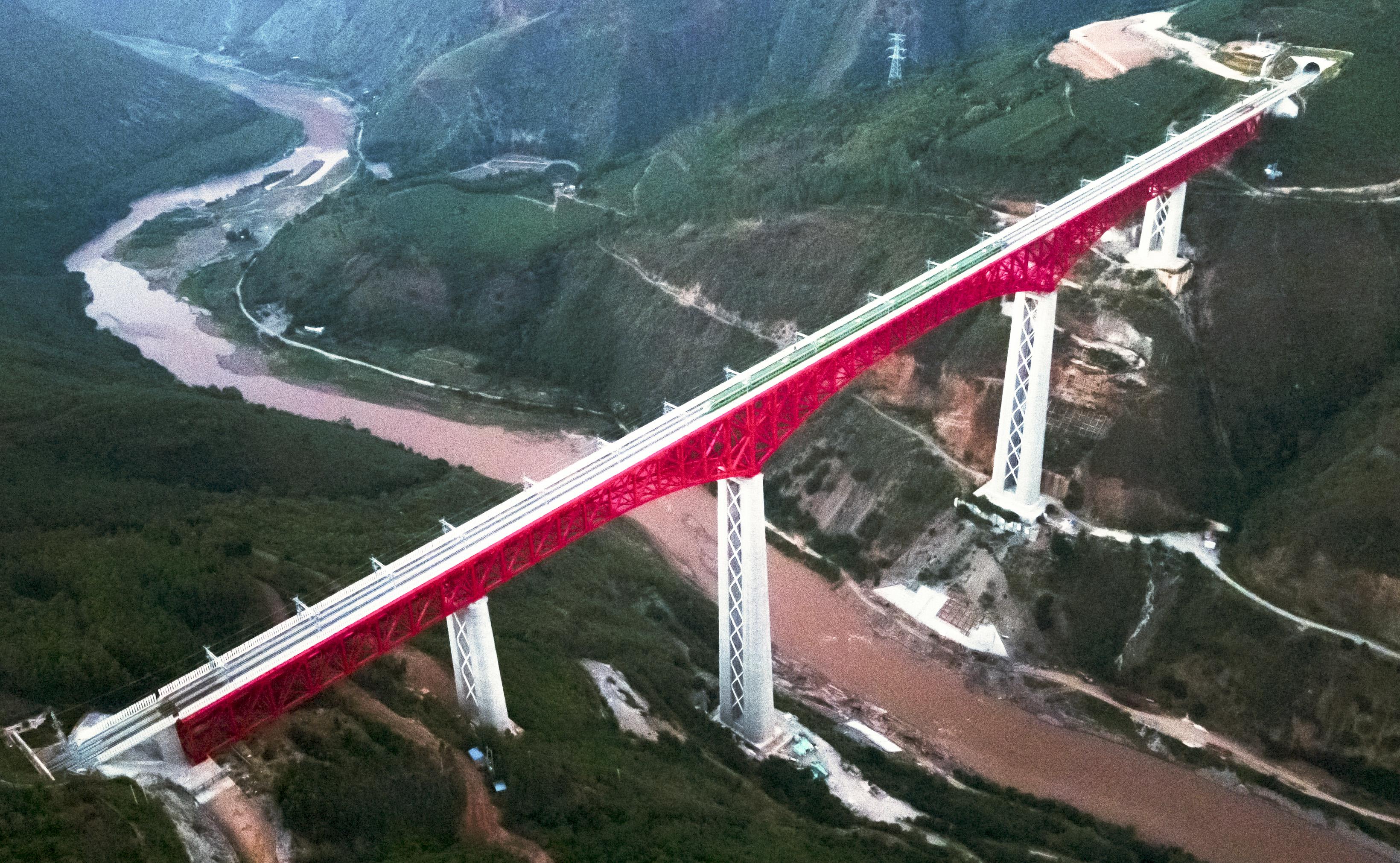 中老鐵路首發(fā)列車駛過中國云南省元江哈尼族彝族傣族自治縣境內的元江雙線特大橋(12月3日攝,無人機照片)。新華社記者 王冠森 攝