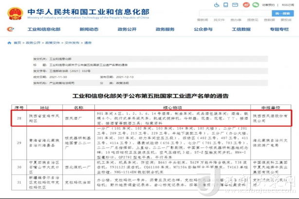 西部決策網(wǎng)訊(韓宗憲)12月13日,工業(yè)和信息化部公布了第五批國(guó)家工業(yè)遺產(chǎn)名單,西鳳酒釀酒工業(yè)遺產(chǎn)群作為唯一的中國(guó)白酒生產(chǎn)釀造項(xiàng)目同全國(guó)其他30家工業(yè)遺產(chǎn)一起進(jìn)入名單。這也是繼6月10日國(guó)家級(jí)非物質(zhì)文化遺產(chǎn)榜單發(fā)布以來(lái),西鳳榮列的又一重磅國(guó)家級(jí)名單。既標(biāo)志了相關(guān)部門和廣大消費(fèi)者對(duì)三千年無(wú)斷代西鳳酒釀造設(shè)備和釀造技藝的肯定,也表示出西鳳酒為中國(guó)白酒發(fā)展作出的突出貢獻(xiàn)。