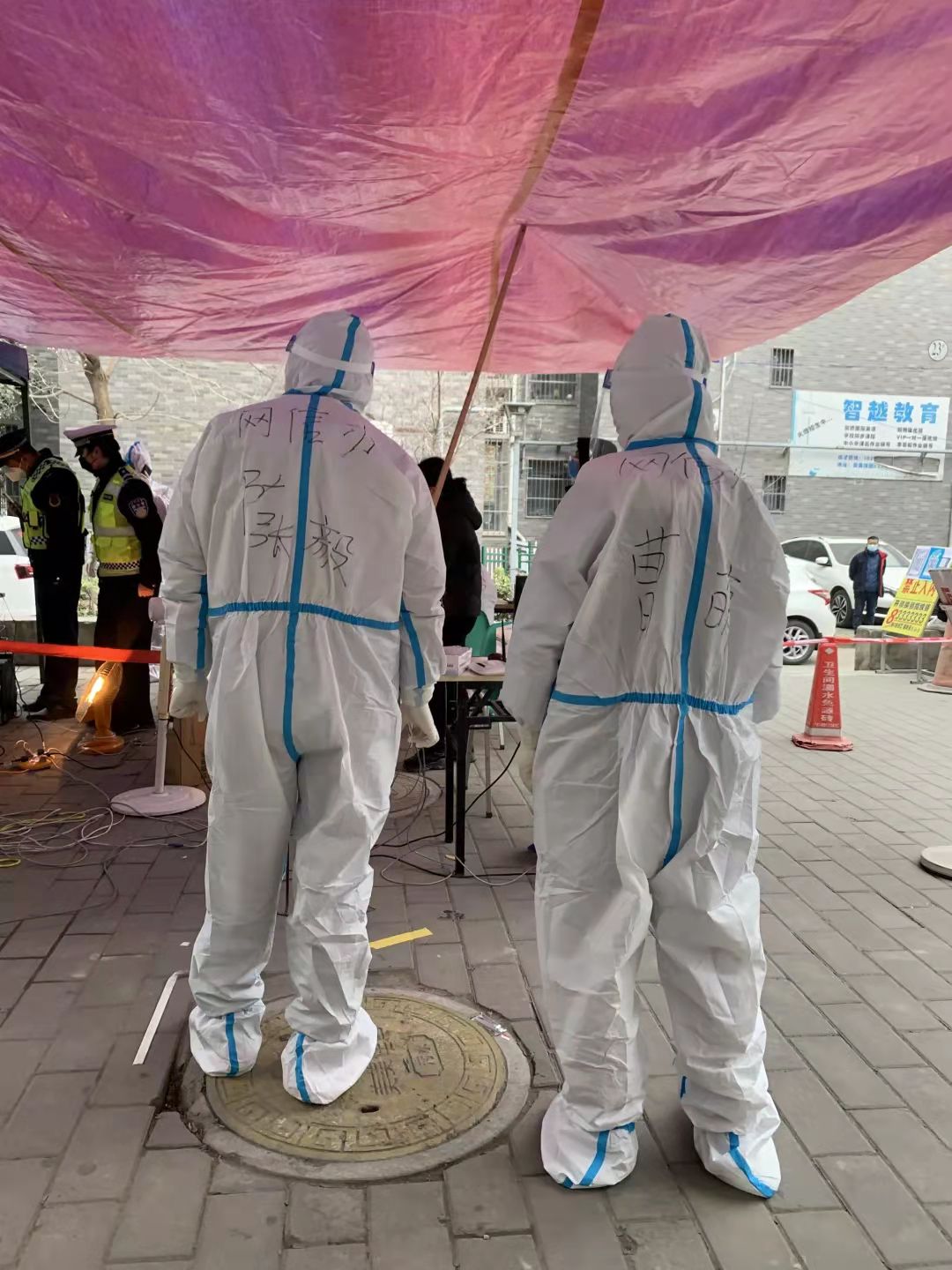 就在隔壁美美佳園小區(qū),張毅、曹萌、胡迪、劉春艷、胡振東、徐晨楊等人也早早鉆進(jìn)了防護(hù)服,從學(xué)習(xí)到上崗、從開始到投入,絲毫沒(méi)有停歇,午餐時(shí)間成了唯一交流的機(jī)會(huì),在微信群里工作的照片就像是默契的鏡子:“已看不清是誰(shuí)的臉,卻能彼此知道你是誰(shuí)。”