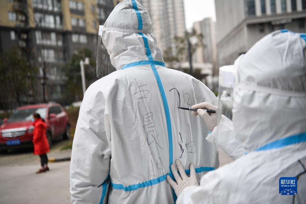 12月27日,在西安市雁塔區(qū)孟村小區(qū),社區(qū)工作人員在盧晨陽的防護服寫加油標(biāo)語。新華社記者 張博文 攝