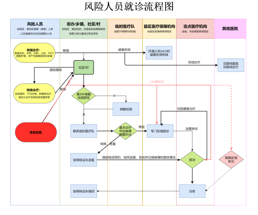 有急診搶救醫(yī)療需求的風(fēng)險(xiǎn)人員,直接撥打120急救電話,同時(shí)通知社區(qū)(村)工作人員對接120救護(hù)車、填寫人員交接單,由120救護(hù)車聯(lián)系風(fēng)險(xiǎn)人員醫(yī)療保障醫(yī)療機(jī)構(gòu)、定點(diǎn)醫(yī)療機(jī)構(gòu),或就近送至具備相應(yīng)診療能力的醫(yī)療機(jī)構(gòu)。診療結(jié)束后,醫(yī)療機(jī)構(gòu)聯(lián)系社區(qū)(村)由縣區(qū)轉(zhuǎn)運(yùn)專班“點(diǎn)對點(diǎn)”接回。
