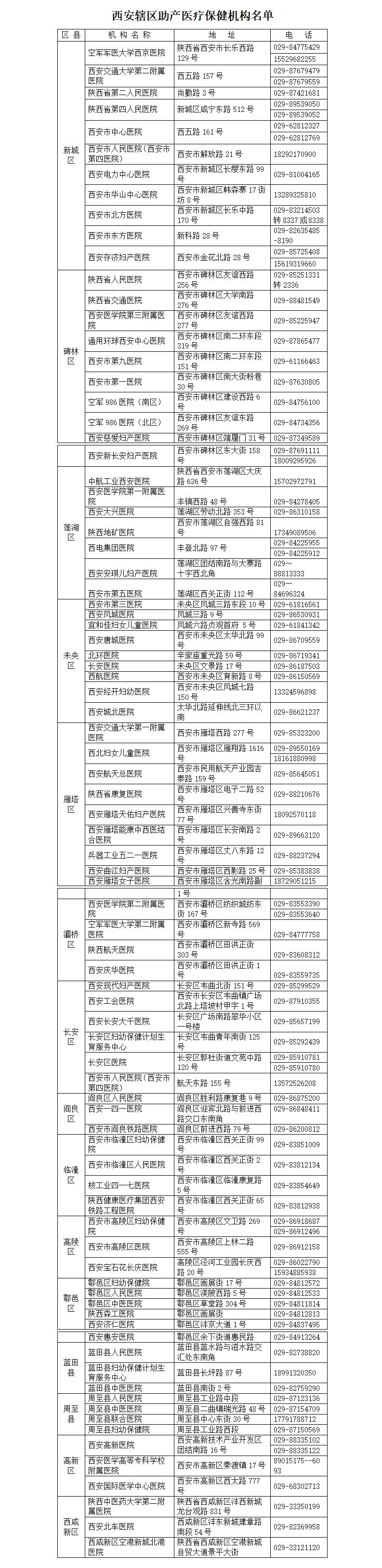 近期陜西省衛(wèi)生健康委整理發(fā)布了西安轄區(qū)助產(chǎn)醫(yī)療保健機(jī)構(gòu)名單(見下表),其他地市助產(chǎn)醫(yī)療保健機(jī)構(gòu)名單由當(dāng)?shù)匦l(wèi)生健康部門自行發(fā)布。如有診療需求,請前往各助產(chǎn)醫(yī)療機(jī)構(gòu)就診。