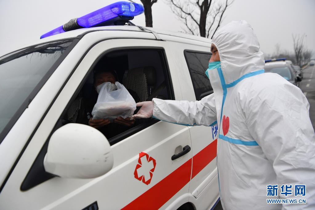 1月4日,在西安市雁塔區(qū),志愿者暢璘將食品送至一位負(fù)責(zé)運(yùn)輸核酸檢測(cè)樣本的救護(hù)車駕駛員手中。新華社記者 張博文 攝