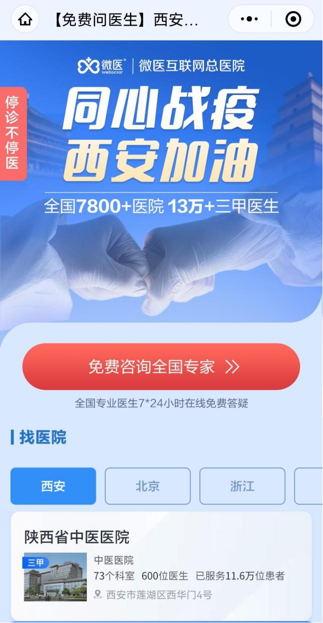 為保障當(dāng)?shù)厝罕娽t(yī)療健康需求,緩解線(xiàn)下醫(yī)療機(jī)構(gòu)壓力,微醫(yī)互聯(lián)網(wǎng)總醫(yī)院第一時(shí)間啟動(dòng)疫情防控應(yīng)急方案,于22日迅速上線(xiàn)“西安抗疫專(zhuān)區(qū)”,集結(jié)全國(guó)專(zhuān)家為西安百姓免費(fèi)提供7*24小時(shí)不間斷的在線(xiàn)咨詢(xún)、防疫科普等服務(wù)。