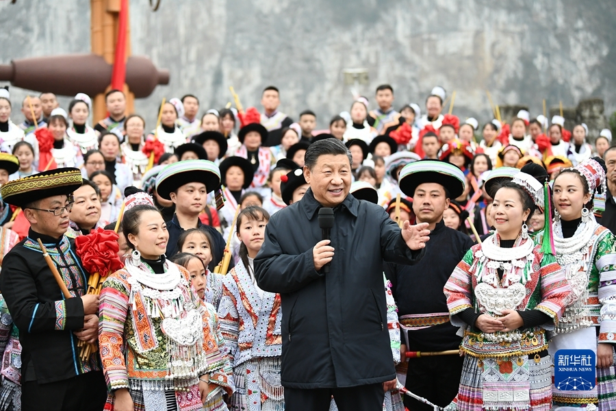 2021年2月3日至5日,中共中央總書(shū)記、國(guó)家主席、中央軍委主席習(xí)近平來(lái)到貴州考察調(diào)研,看望慰問(wèn)各族干部群眾,向全國(guó)各族人民致以美好的新春祝福。這是3日下午,習(xí)近平在畢節(jié)市黔西縣新仁苗族鄉(xiāng)化屋村文化廣場(chǎng)上,向全國(guó)各族人民、港澳臺(tái)同胞和海外僑胞拜年。