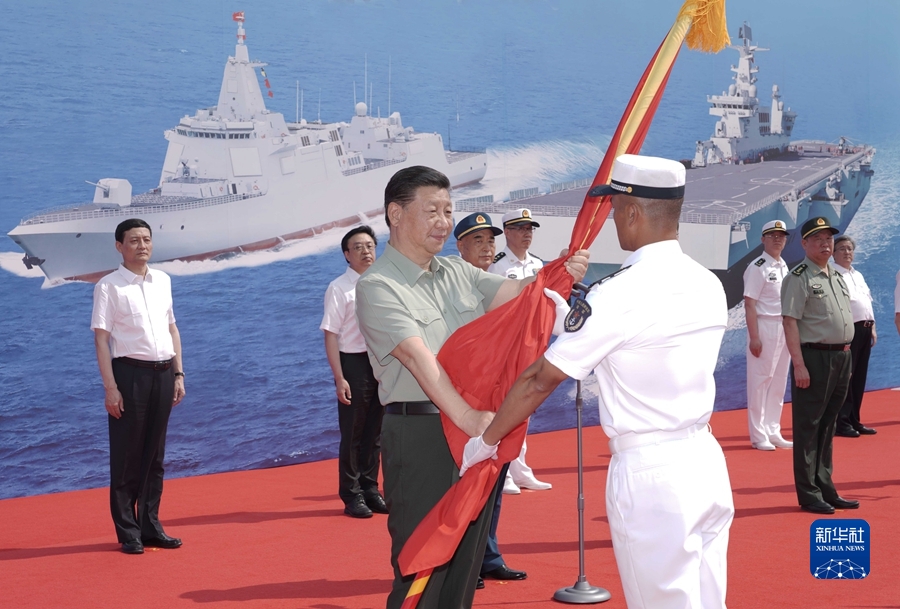 2021年4月23日,海軍三型主戰(zhàn)艦艇——長(zhǎng)征18號(hào)艇、大連艦、海南艦在海南三亞某軍港集中交接入列。中共中央總書(shū)記、國(guó)家主席、中央軍委主席習(xí)近平出席交接入列活動(dòng)并登上艦艇視察。這是習(xí)近平向長(zhǎng)征18號(hào)艇授予軍旗、命名證書(shū)。