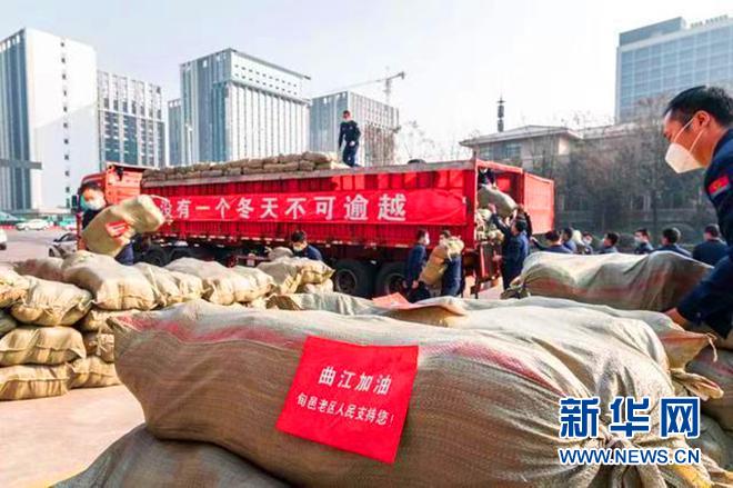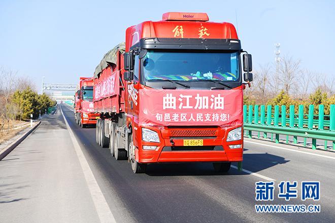 “沒有一個(gè)冬天不會(huì)過去,沒有一個(gè)春天不會(huì)到來。”2022年元旦過后,貼著車體標(biāo)語的運(yùn)輸車隊(duì),滿載著30萬陜西旬邑紅色老區(qū)父老鄉(xiāng)親暖暖的情誼直奔西安曲江。