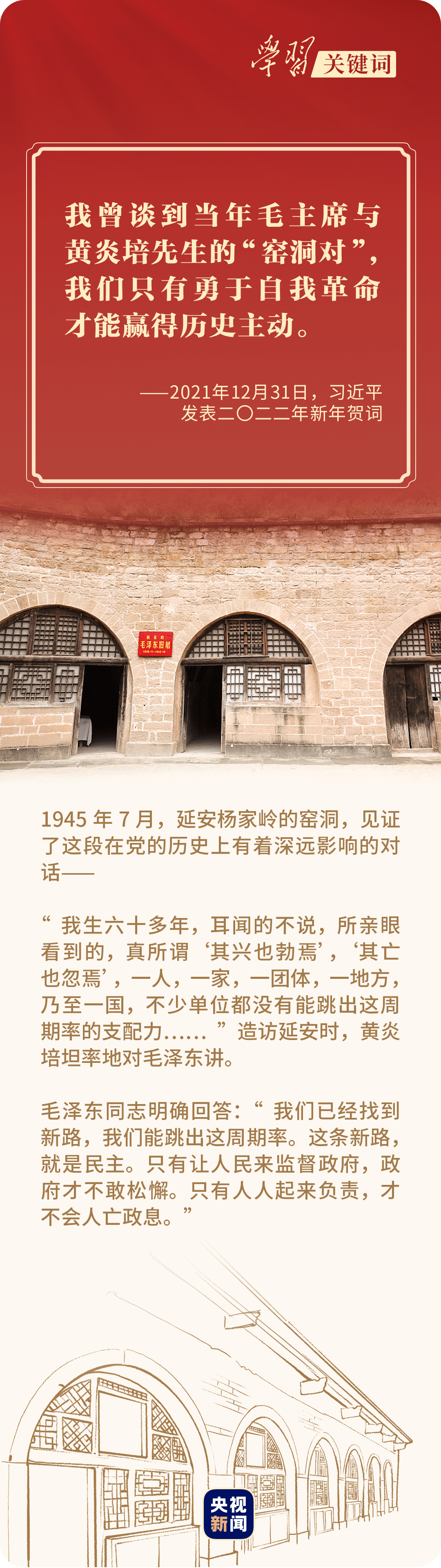 2021年11月11日,在黨的十九屆六中全會上,習(xí)近平總書記給出新解:“毛澤東同志在延安的窯洞里給出了第一個答案,這就是‘只有讓人民來監(jiān)督政府,政府才不敢松懈’。經(jīng)過百年奮斗特別是黨的十八大以來新的實踐,我們黨又給出了第二個答案,這就是自我革命。”