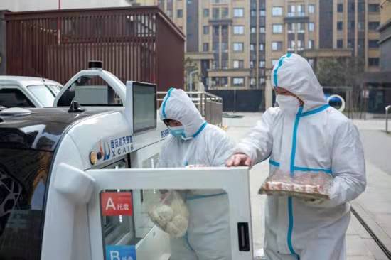 關(guān)好柜門后,白色小車便沿著設(shè)定軌道緩緩駛向附近的鳳鳴小區(qū)。穿著防護服的工作人員早已等候在指定位置,他們打開寫有樓棟號的柜門取出貨物,關(guān)上柜門后,小車又自動駛向下一站……這種科技感十足的配送方式,既提高了效率,又實現(xiàn)了全程無接觸精準(zhǔn)配送。