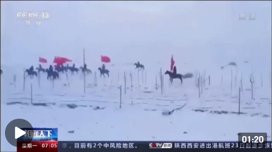 這段視頻拍攝于1月20日,中國(guó)國(guó)家越野滑雪隊(duì)結(jié)束在新疆溫泉縣集訓(xùn),踏上趕赴北京冬奧會(huì)的征途。目睹運(yùn)動(dòng)員們刻苦訓(xùn)練的附近山區(qū)牧民,特意挑選20多匹駿馬自發(fā)組成馬隊(duì),高舉國(guó)旗騎馬追趕車隊(duì),并大聲吶喊助威。