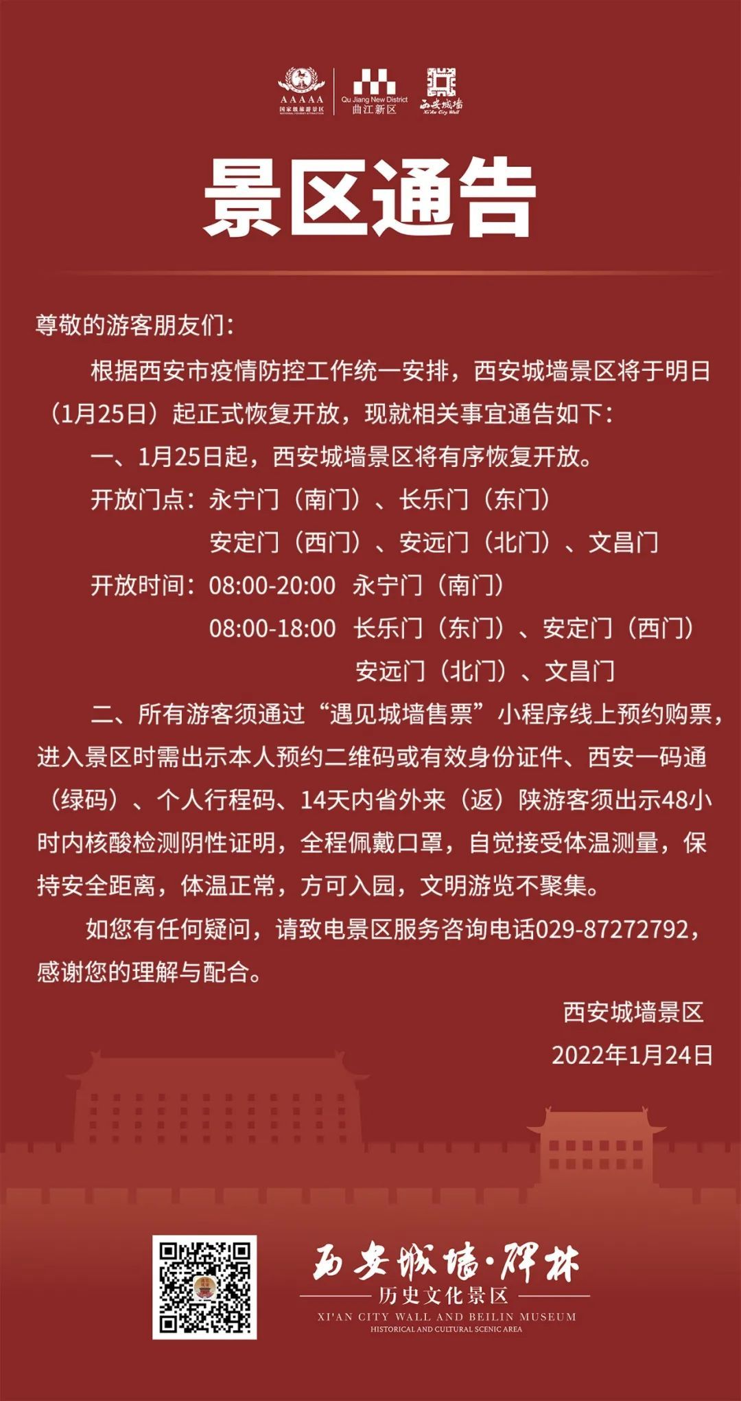 根據(jù)西安市疫情防控工作統(tǒng)一安排,西安城墻景區(qū)將于明日(1月25日)起正式恢復開放,現(xiàn)就相關事宜通告如下: