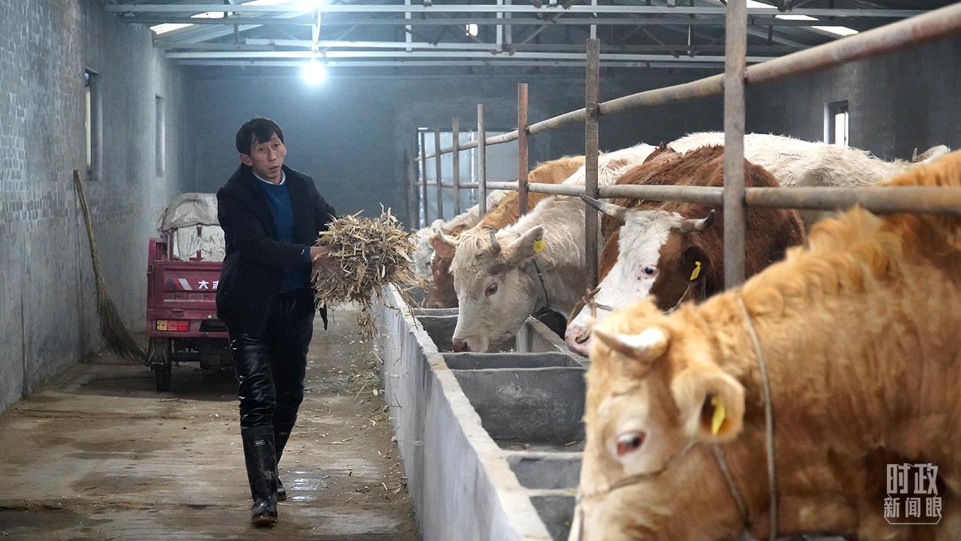 △段村經(jīng)濟(jì)合作社養(yǎng)牛基地,工作人員正在添飼料。(總臺(tái)央廣記者潘毅拍攝)