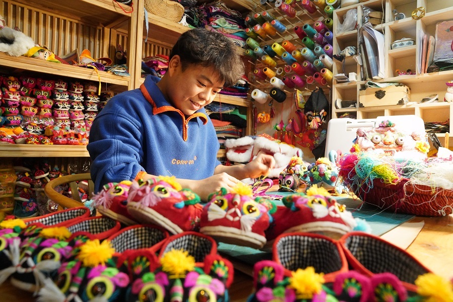 “老虎是百獸之王,是保平安的吉祥物,也是我們民俗文化中‘福’字的諧音。”夏璐璐介紹,他在設(shè)計制作虎頭帽、虎頭鞋的過程中,會使用不同的手法、材質(zhì)和造型,這也讓小老虎看起來更加可愛。