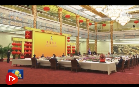 宴會(huì)在喜慶歡樂(lè)祥和的氣氛中進(jìn)行。結(jié)束時(shí),習(xí)近平和彭麗媛同國(guó)際貴賓們?cè)凇兑黄鹣蛭磥?lái)》的樂(lè)曲聲中揮手道別。