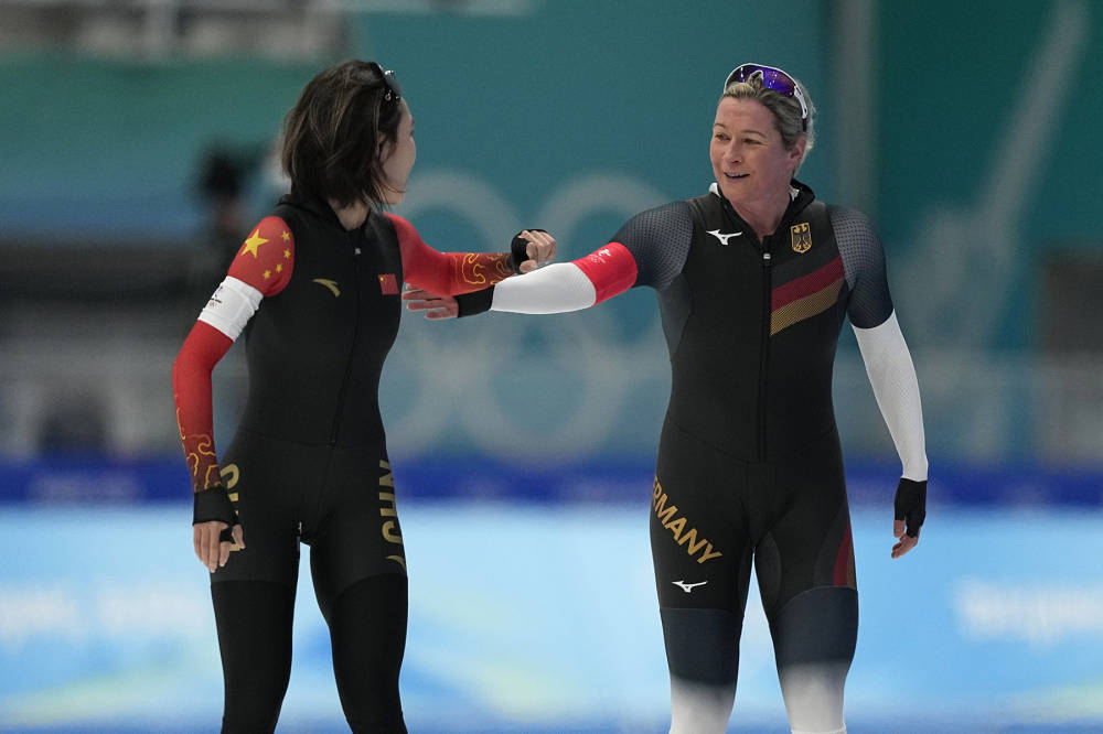 △比賽結(jié)束后,中國(guó)選手阿合娜爾向德國(guó)老將佩希施泰因表達(dá)敬意,佩希施泰因微笑著鼓勵(lì)阿合娜爾。