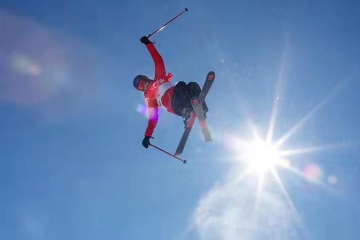 △北京冬奧會(huì)期間,藍(lán)天白云下,正在參加比賽的運(yùn)動(dòng)員。