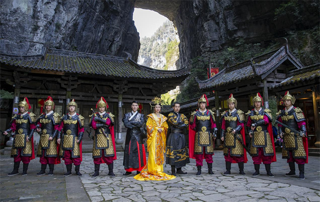 “女王駕到”“恭迎女王陛下”“諸位請起,游玩到此,觀景甚美,諸位與我,共享此景。”在天生三橋景區(qū)天福官驛客棧,一群身形魁梧的帶刀侍衛(wèi),整齊的站在驛站門口兩側(cè)恭迎每位入園的“女王”?,F(xiàn)場儀式感爆棚,一身金黃的“女王”霸氣外露。驛站內(nèi)熱鬧的氛圍吸引了眾多游客參與,有的上前與侍衛(wèi)互動拍照,有的主動穿上“女王”服體驗霸氣女王范,有的還主動表演起了電影里女王翻牌的有趣橋段。“今天我最大,這樣過節(jié)著實過癮”玩得正起勁的劉女士表示,這是她過得最好玩、最具儀式感的女王節(jié)。