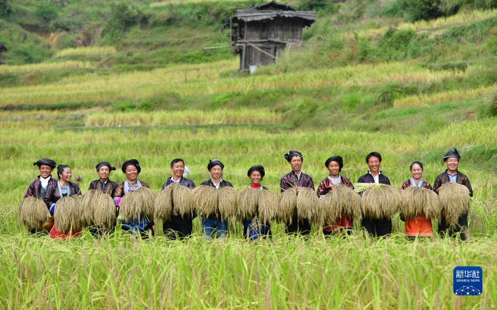 在廣西融水苗族自治縣良寨鄉(xiāng)大里村,村民們展示剛剛收割的脫貧特色產(chǎn)品——紫黑香糯(2018年10月12日攝)。 新華社記者 黃孝邦 攝