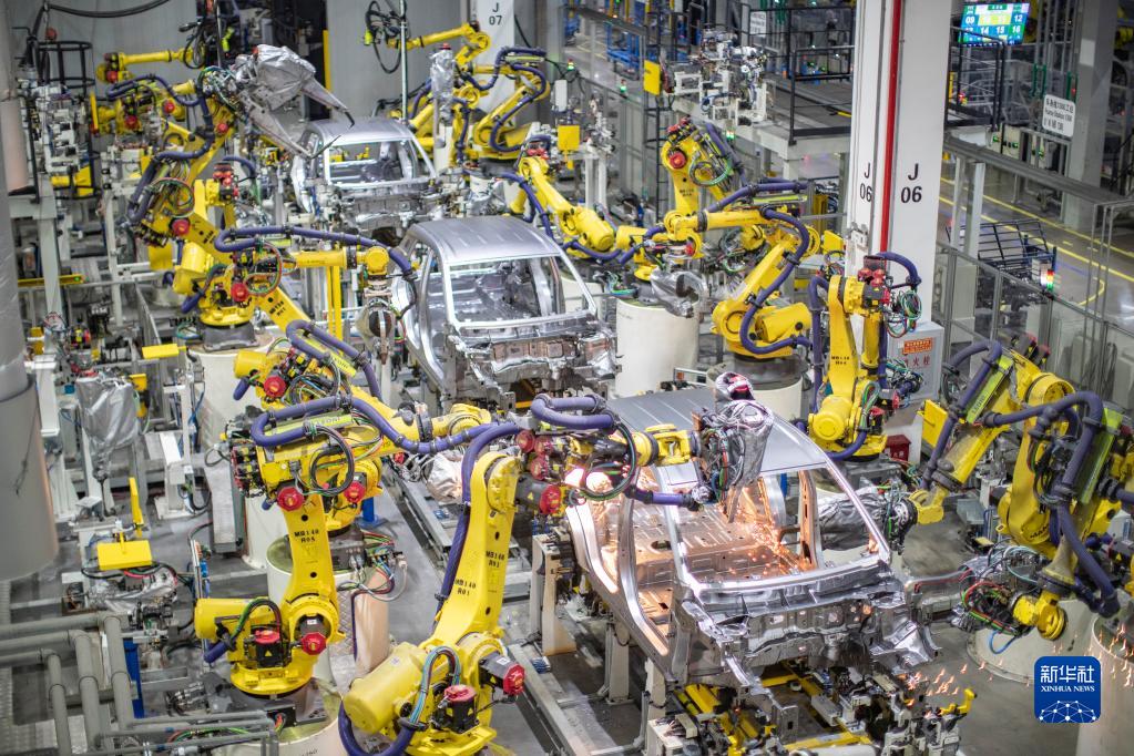 重慶一家新能源汽車企業(yè)使用智能化焊接機器人進行焊接作業(yè)(2021年4月2日攝)。 新華社記者 黃偉 攝