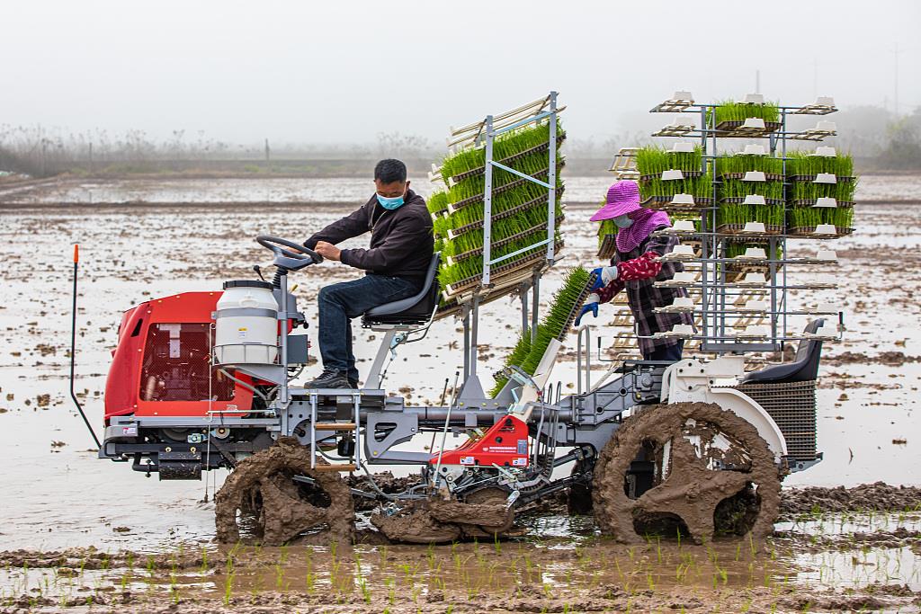 △2022年3月,浙江省溫嶺市一家庭農(nóng)場,農(nóng)民駕駛缽苗擺栽機進(jìn)行作業(yè)。