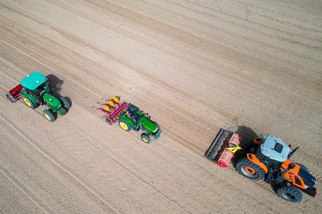 △2022年3月,寧夏吳忠,運用北斗導(dǎo)航無人駕駛播種技術(shù),紅寺堡鎮(zhèn)一生產(chǎn)基地開展滴灌節(jié)水千畝春小麥播種。