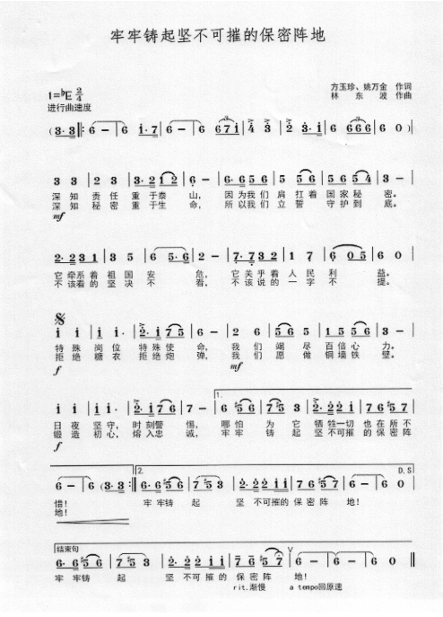 慶祝建黨百年獲獎歌曲作品選集——《牢牢鑄起堅不可摧的保密陣地》詞曲。