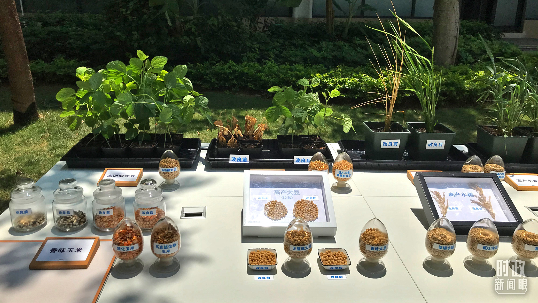△崖州灣種子實(shí)驗(yàn)室,玉米、大豆和水稻改良前后的對比樣品。(總臺(tái)央視記者石偉明拍攝)