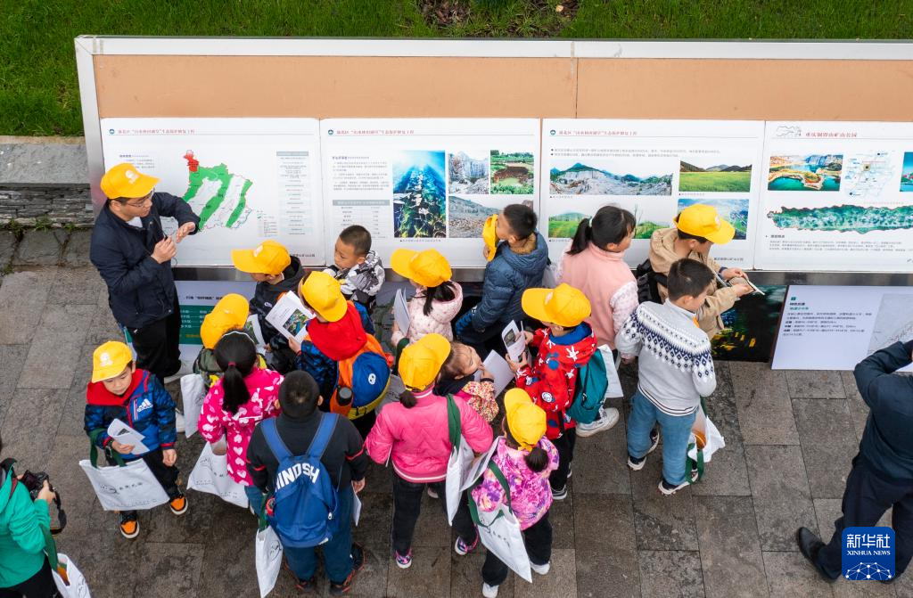 4月17日,參加活動的中小學(xué)生在地質(zhì)專業(yè)工作人員的帶領(lǐng)下,對銅鑼山礦山公園的地質(zhì)遺跡和生態(tài)修復(fù)進行科學(xué)考察(無人機照片)。