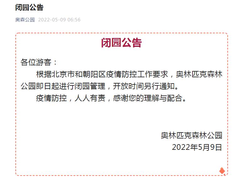 “奧森公園”微信公眾號9日發(fā)布閉園公告,根據(jù)北京市和朝陽區(qū)疫情防控工作要求,奧林匹克森林公園即日起進(jìn)行閉園管理,開放時(shí)間另行通知。