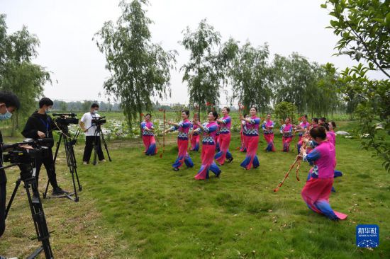 5月15日,肥西縣柿樹崗鄉(xiāng)村民通過“云上”直播表演當?shù)貍鹘y(tǒng)非遺文化項目蓮湘舞。新華社記者劉軍喜攝