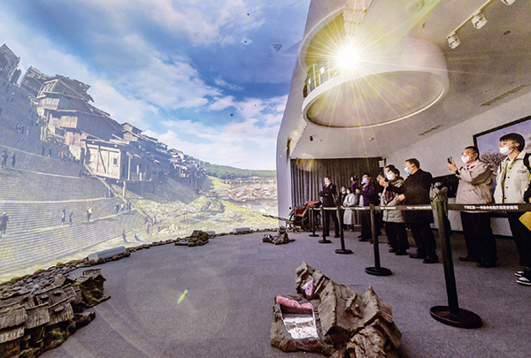 圖為在重慶紅巖革命紀(jì)念館“紅巖記憶”數(shù)字體驗廳內(nèi),觀眾們觀看以雙曲三維穹幕技術(shù)展示的場景。 新華社記者 李賀/攝