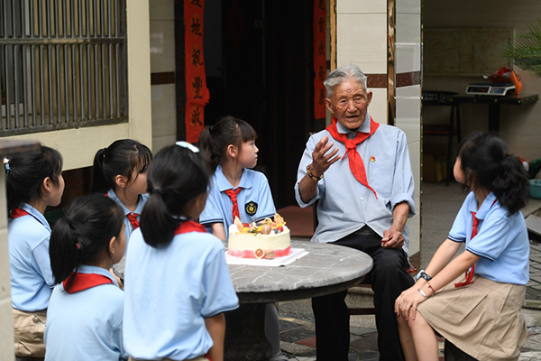 2020年6月28日,浙江省湖州市吳興區(qū)八里店鎮(zhèn)組織小學(xué)生開展“童心向黨”主題繪畫、聆聽老黨員講故事、參觀紅色教育基地等活動。圖為吳興區(qū)第一小學(xué)學(xué)生聆聽八里店鎮(zhèn)前村村老黨員陳金茂(右二)講故事。新華社記者 黃宗治/攝