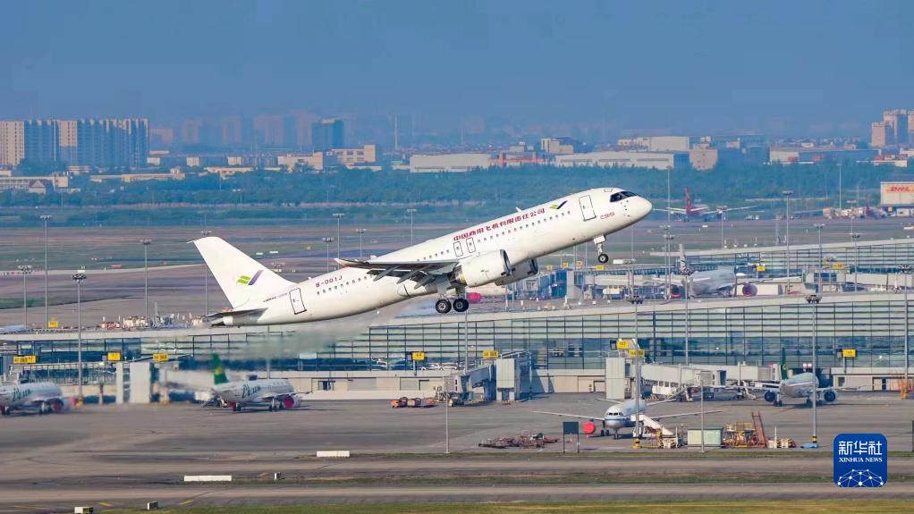 5月14日6時52分,編號為B-001J的C919大飛機從上海浦東機場第4跑道起飛,于9時54分安全降落,標志著中國商飛公司即將交付首家用戶的首架C919大飛機首次飛行試驗圓滿完成。新華社發(fā)