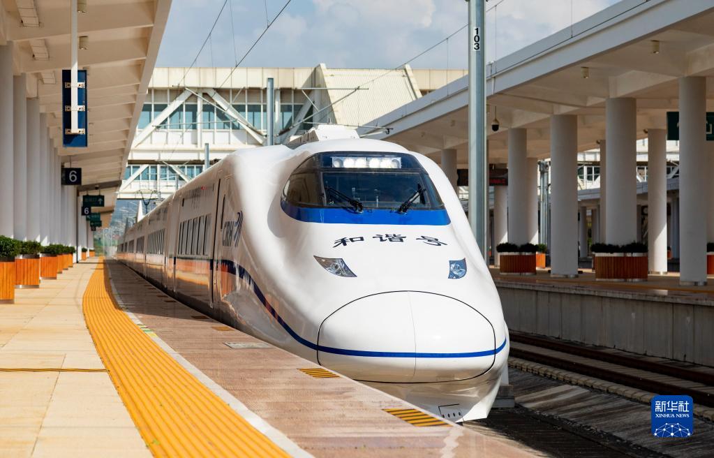 8月23日,綜合檢測車駛出彌蒙高鐵彌勒站。新華社發(fā)(周濤 攝)