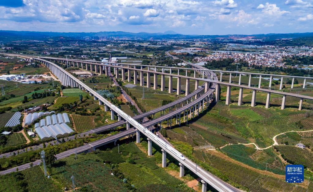 8月23日,綜合檢測車在彌蒙高鐵彌勒站附近上行線行駛,遠處是下行線,中間橫向鐵路是南寧至昆明客運專線,下穿高速是瀘彌高速(無人機照片)。新華社記者 陳欣波 攝