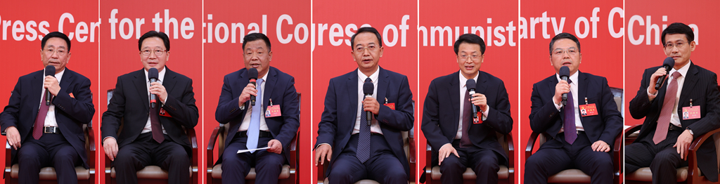 10月19日,中國(guó)共產(chǎn)黨第二十次全國(guó)代表大會(huì)新聞中心舉行集體采訪。山東、河南、湖北、湖南、廣東、廣西、海南代表團(tuán)新聞發(fā)言人出席,介紹代表團(tuán)學(xué)習(xí)討論二十大報(bào)告情況,并回答記者提問(wèn)(拼版照片)。新華社記者 張玉薇 攝