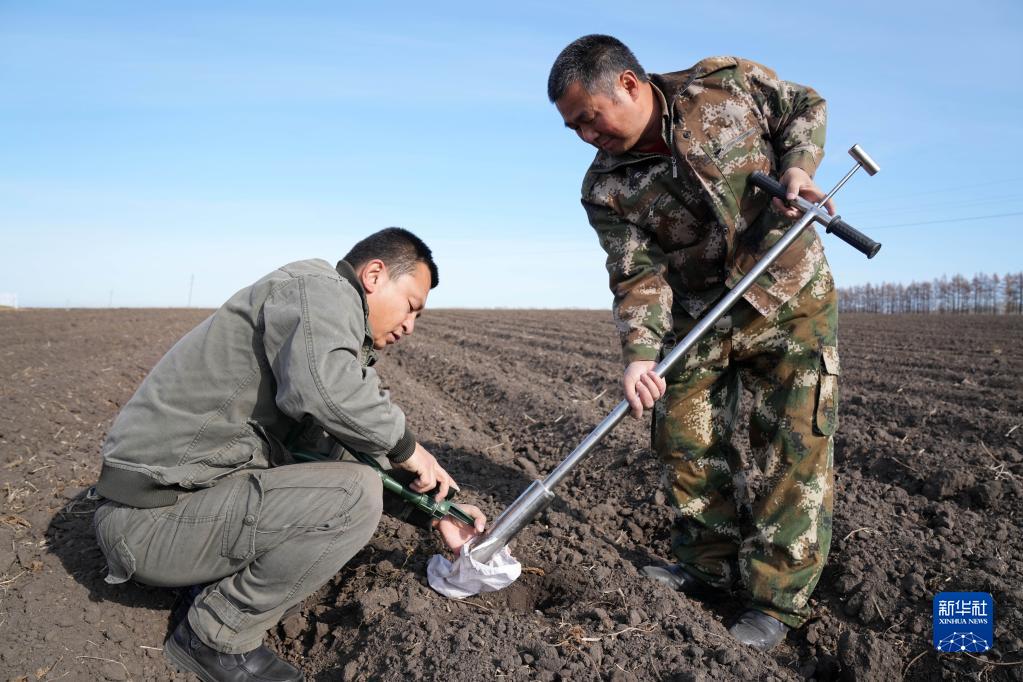 10月20日,北大荒農(nóng)墾集團有限公司北安分公司趙光農(nóng)場有限公司技術(shù)人員在取土樣。新華社記者 王建威 攝
