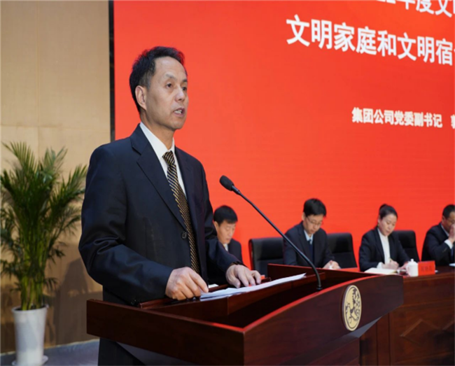 西鳳集團(tuán)公司黨委副書記郭拴新宣讀《關(guān)于命名表彰公司2022年度文明單位、文明班組、文明家庭和文明宿舍的決定》