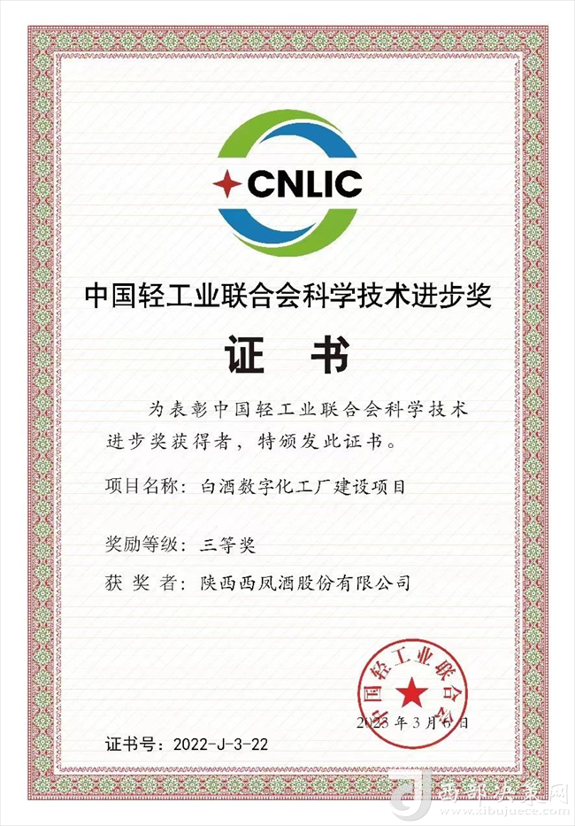 西部決策網(wǎng)訊(記者劉玉 韓宗憲 通訊員吳婷蘭 馬迪)近日,中國輕工業(yè)聯(lián)合會五屆三次、中華全國手工業(yè)合作總社八屆三次理事會在福建廈門召開。會議宣讀了《2022年度中國輕工聯(lián)合會科技獎決定》并舉行了頒獎儀式,陜西西鳳酒股份有限公司申報的“白酒數(shù)字化工廠建設項目”榮獲科學技術進步三等獎。