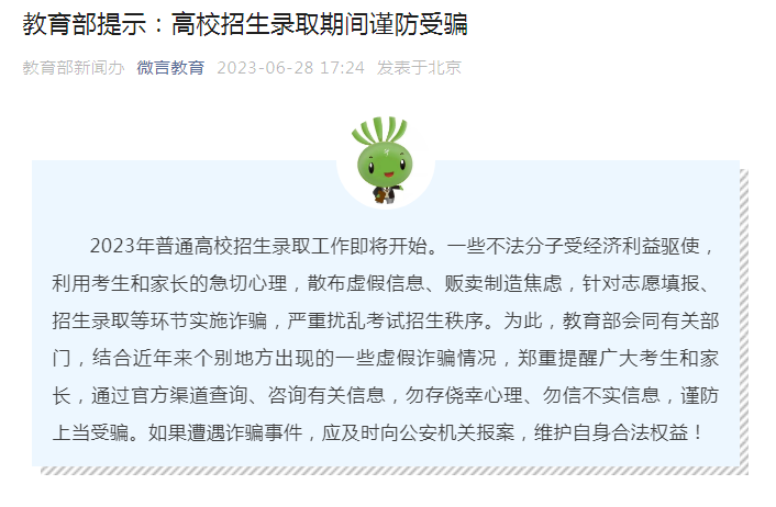 2023年普通高校招生錄取工作即將開(kāi)始。教育部會(huì)同有關(guān)部門(mén),結(jié)合近年來(lái)個(gè)別地方出現(xiàn)的一些虛假詐騙情況,鄭重提醒廣大考生和家長(zhǎng),通過(guò)官方渠道查詢(xún)、咨詢(xún)有關(guān)信息,勿存僥幸心理、勿信不實(shí)信息,謹(jǐn)防上當(dāng)受騙。