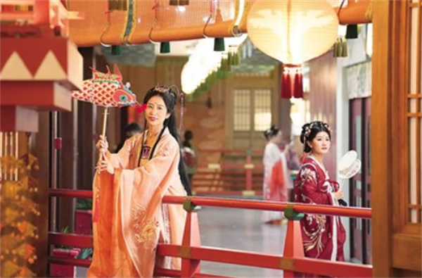 在遍布名勝古跡的西安市內,還有一座“平行時空里的長安”。走進長安十二時辰主題街區(qū),游客不僅可以身著唐代服飾穿行在市井街區(qū),與游街花魁來個親密接觸,還能手握“開元通寶”代幣,到酒肆里買壺好酒,觀看歌舞。