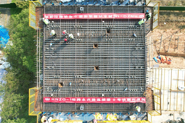 跨京滬高鐵立交特大橋位于滁河西岸,安徽省滁州市南譙區(qū)烏衣鎮(zhèn)和全椒縣十字鎮(zhèn)境內,總長17.5公里。其中跨永興路連續(xù)梁為三跨變截面箱梁,跨越滁州市南讓區(qū)永興路,橋跨位置對應跨京滬高鐵立交特大橋180#墩至183#墩,全長177.7米,0#塊長度達12米。由于0#段內預應力筋布置復雜、非預應力筋密集,要求一次澆筑成型,施工難度大。為保證施工質量,此次澆筑總體以“統(tǒng)籌規(guī)劃、科學組織、重點先行、分段展開、均衡生產、標準化作業(yè)、有序推進”為原則展開施工。
