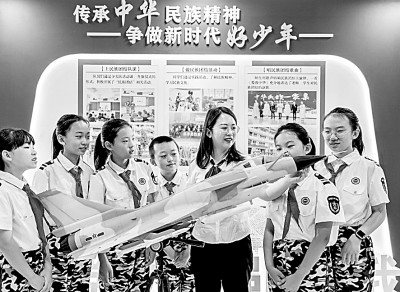 9月14日,內(nèi)蒙古自治區(qū)呼和浩特市玉泉區(qū)五塔寺東街小學(xué)學(xué)員們學(xué)習(xí)國防知識,增強(qiáng)國防觀念。丁根厚攝/光明圖片